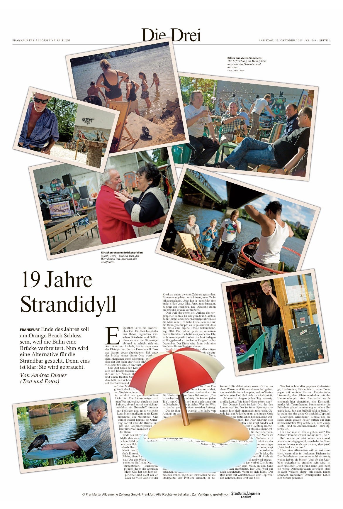 Nun ist es so weit, Ende des Jahres ist endgültig Schluß. 2026 ist Baubeginn für die Brückenerweiterung, die ICEs brauchen endlich eine eigene Trasse, um sich um Frankfurt herum nicht dauernd zu verspäten. Für den Frankfurter Westen ist das ein harter Schlag, denn es gibt ja sonst kaum etwas. Wo soll man sich denn jetzt treffen? Wo kostet das Bier sonst noch drei fuffzig? Wo ist es egal, wer man ist und wie man aussieht? Eilends wurde eine Petition aufgesetzt, siebentausend Unterschriften hat sie, die Stadtpolitik will sich nun kümmern, der Beach ist Chefsache, Alternativen werden geprüft.