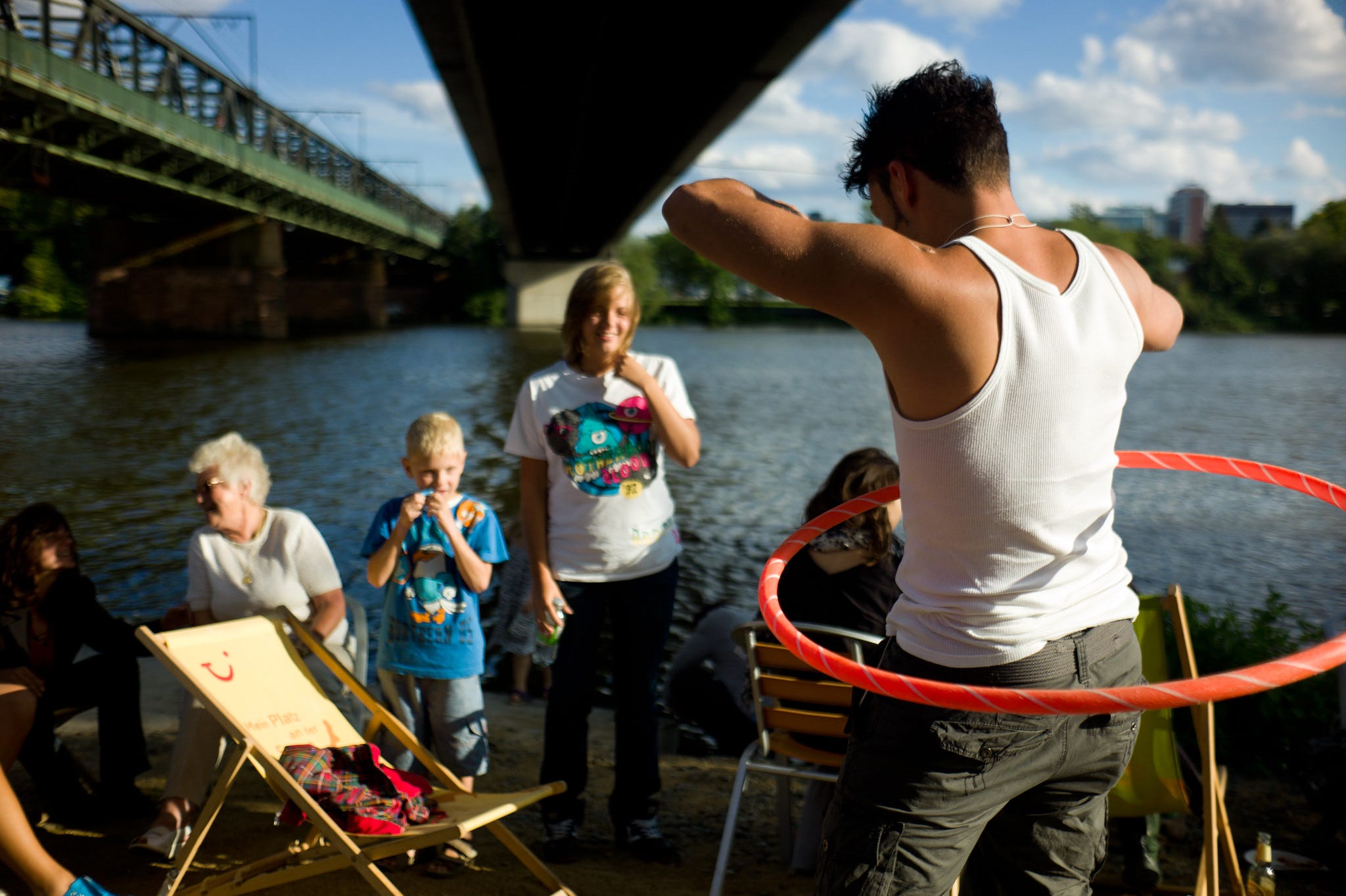 Ich hatte damals gerade meine Leica M9 relativ frisch, war ahnungslos und schwer in das Gerät verliebt, schleppte es überall mit herum – und so eben auch zum Orange Beach, wenn ich dort wochenends aufschlug, mit einem Buch oder zum Babbeln, manchmal auch mit Badeanzug (der Main ist sommers erstaunlich gut temperiert). Dann begann ich mein Volontariat bei der F.A.Z. im Gallus und fuhr jeden Morgen und jeden Abend mit dem Fahrrad dort vorbei, und abends blieb ich dort öfter noch hängen. Besonders, wenn das Wetter gut war und mich daheim ohnehin nur eine viel zu heiße Dachwohnung erwartete.